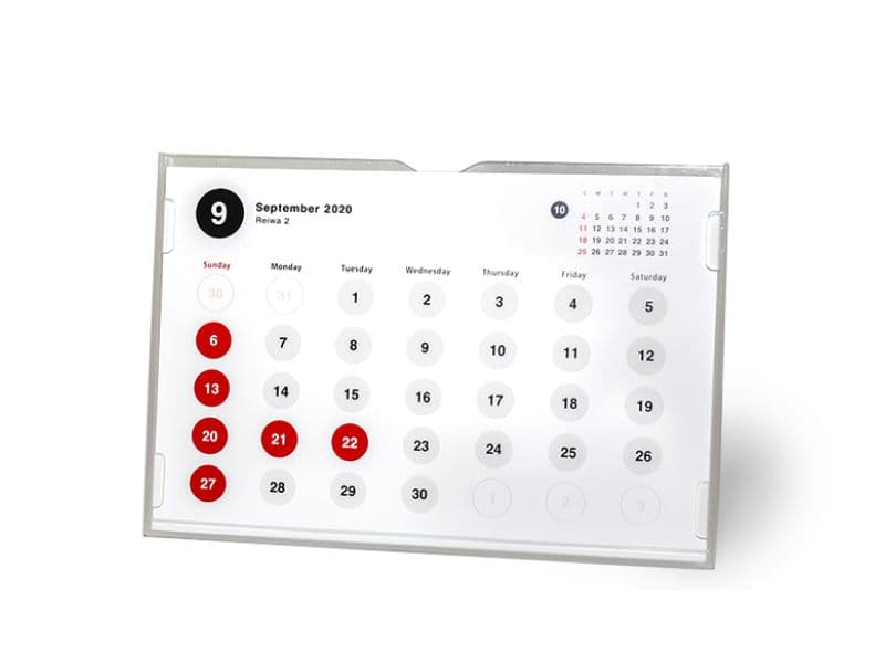 | プラスチックケースに各月のカレンダーを差しこむ形の卓上カレンダーです。カレンダーをケース内に収納してコンパクトに持ち運べるため、配布する際にたいへん便利です。デジタルオンデマンド印刷との組み合わせで小ロットも対応可能です。 |