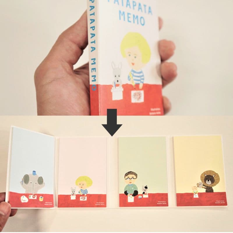 文字通りパタパタとコンパクトに折り畳めるメモ帳。1枚の台紙に4種類のデザインのメモ帳を配置。折り込まれた台紙を開くと中から色んなメモが登場、閉じると小さい本みたいになるかわいいメモ帳です。サイズは70×103と小ぶりですが計80枚ものメモ帳は十分使えるボリューム。